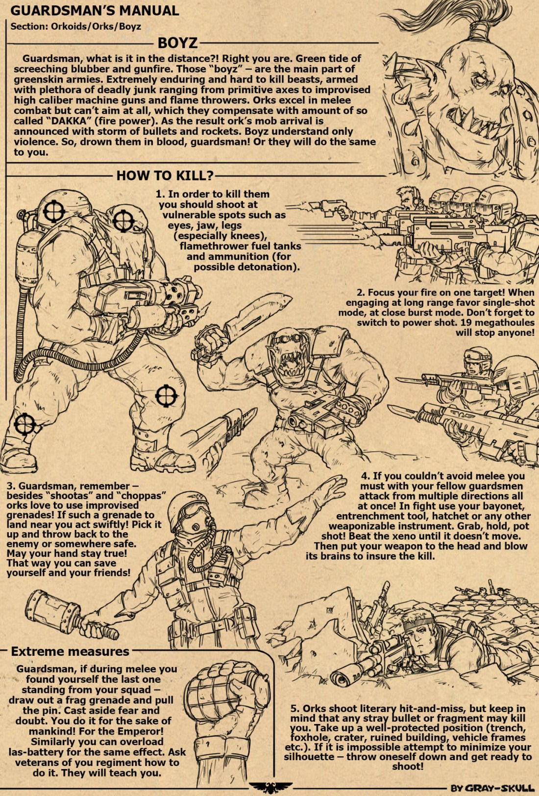 This is how I see the Imperial Infantryman’s Uplifting Primer to be honest. I get that it’s funny seeing the hyper-propaganda like “orks are all weedy and sickly and easily killed” but I struggle to get behind that being the root of all Guard training. That’s why I prefered the Munitorum Manual, it reads more like a genuine military guide.