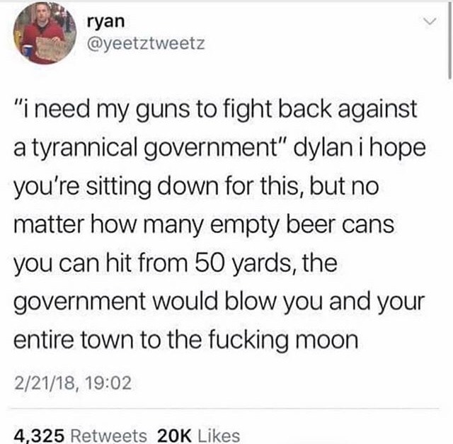 Like, if you really think that the government would calmly just murder entire towns wholesale to get rid of one person’s guns, maybe that’s a reason for you to get a gun and stage a violent revolution? Because any government that WOULD do that doesn’t deserve to have that kind of power over us?