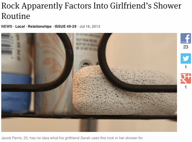 “I guess at some point while she’s showering, she rubs a rock on her body,” said Ferris, expressing what he claimed was “the only possible conclusion” about the light-gray rock in his girlfriend’s bathroom. “I mean, it looks sort of nice, so she could just have it there for decoration or something. But it’s usually right near all the other soaps and her loofah, so I think it’s probably something she actually uses while under the water.”